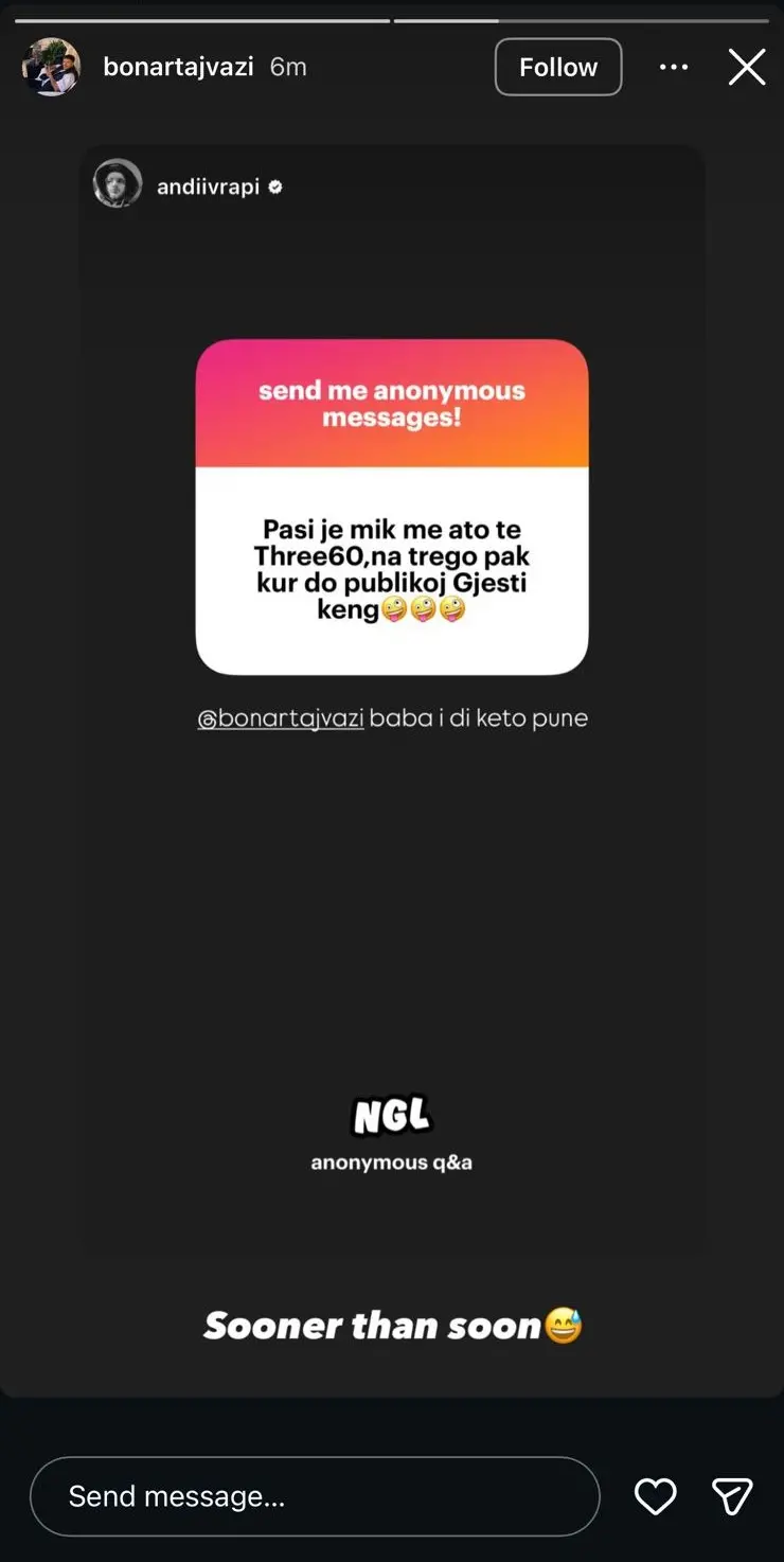 I pyetur nga ndjekësit se kur do të publikojë projektin e radhës, ai u përgjigj: “Sooner than soon” (Më shpejt se sa shpejt).