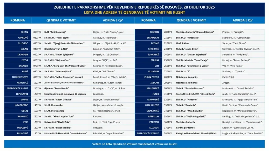 Kjo është lista dhe adresat e qendrave të votimit për votimin me kusht më 28 dhjetor 2025: