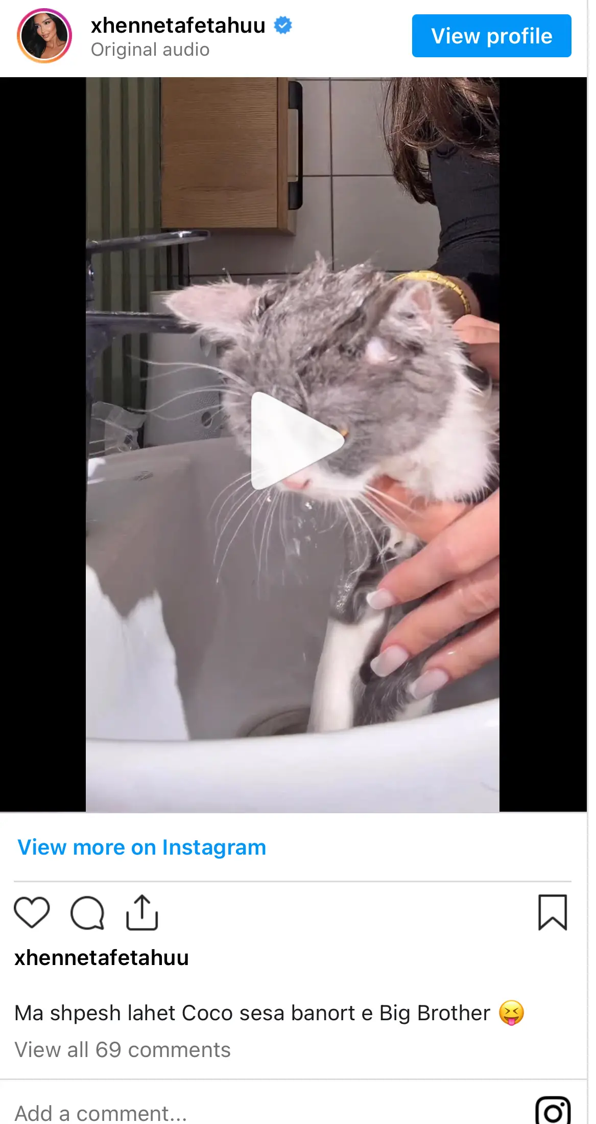 Një video e publikuar në Tik-Tok nga Xheneta tregon momentin kur ajo është duke e larë macen e saj, Coco-n.