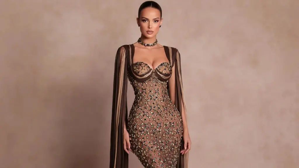 Fustani i saj i gjatë dhe vezullues është një shembull i elegancës dhe stilit që përfaqëson Xhesika, duke nënvizuar format e saj të përkryera.