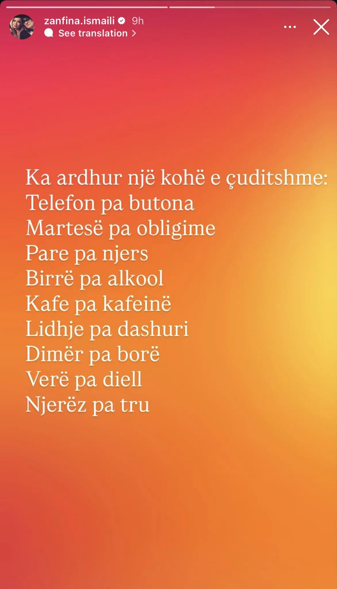 Këngëtarja Zanfina Ismaili ka ndarë një reflektim të thellë mbi marrëdhëniet moderne, duke e shoqëruar këtë me disa fenomene që e karakterizojnë jetën e sotme.