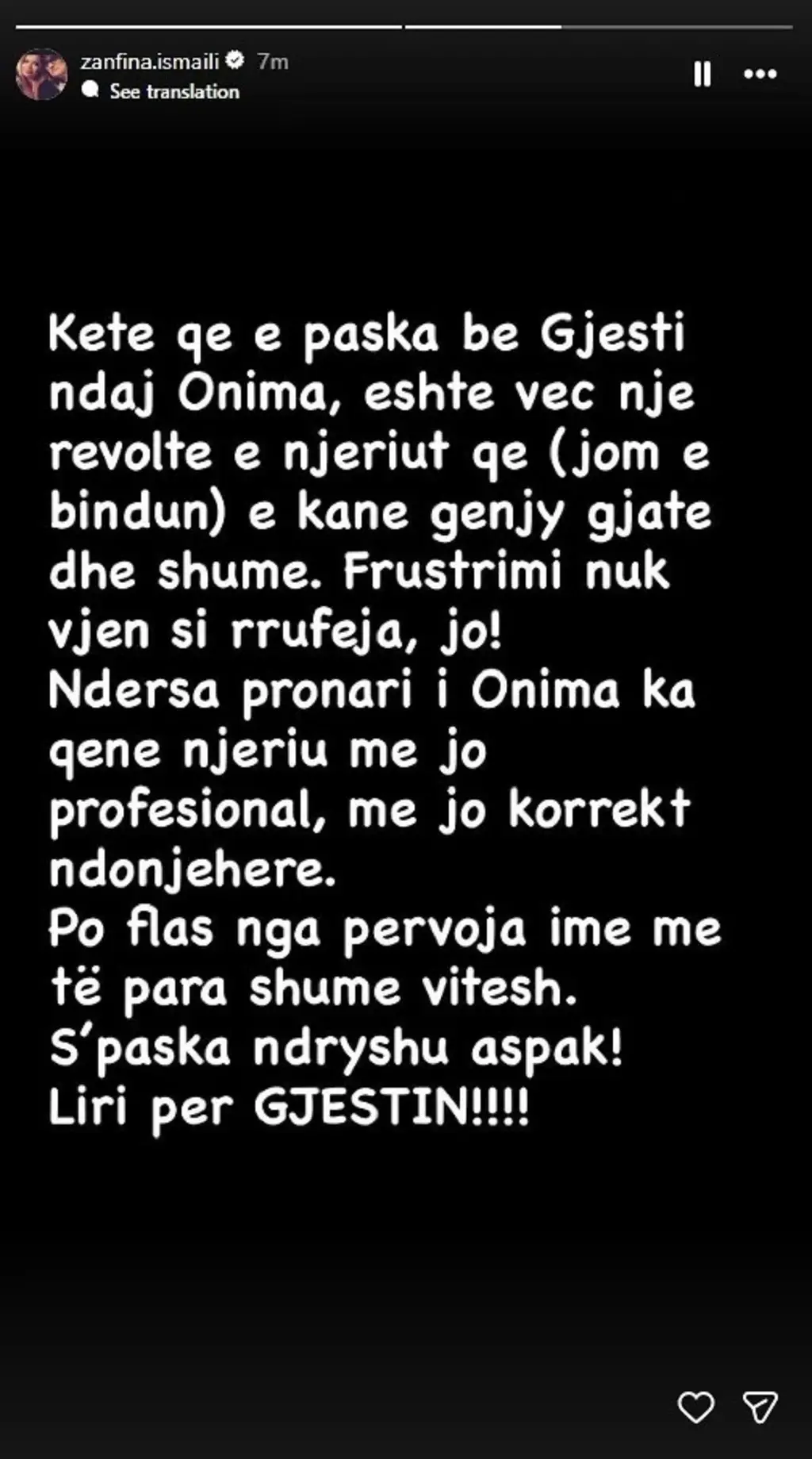 Frustrimi nuk vjen si rrufeja, jo! Ndërsa pronari i Onima ka qenë njeriu më jo profesional, më jo korrekt ndonjëherë. Po flas nga përvoja ime para shumë vitesh. S’paska ndryshuar aspak! Liri për Gjestin”, ka shkruar Zanfina në InstaStory.