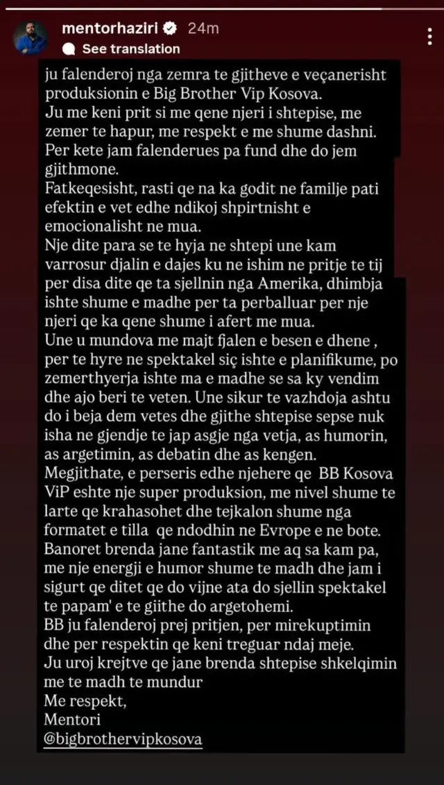 Në një reagim të sinqertë dhe emocional, Haziri ka rrëfyer se pas largimit fshihej një dhimbje e thellë familjare.